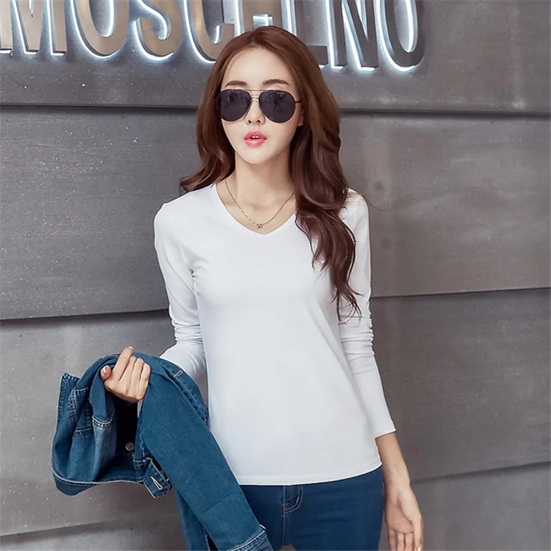 BEST SELLER 1802 # Photo Shoot 2019 Autumn Clothing V-neck Black And White Solid Color T-shirt Women's Long-Sle