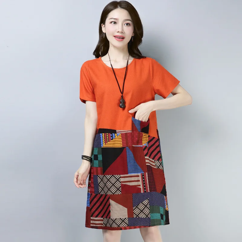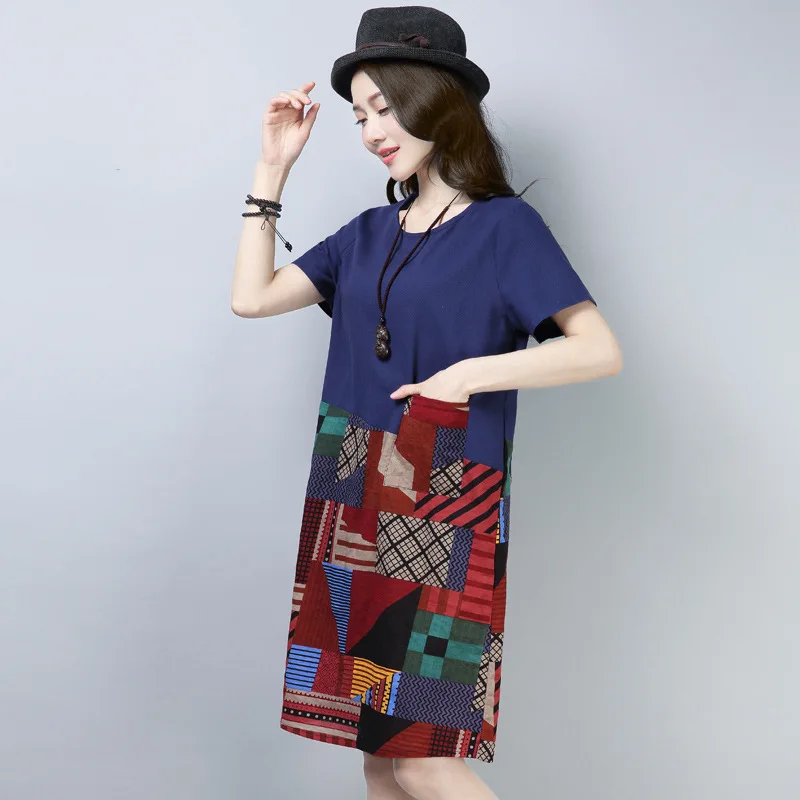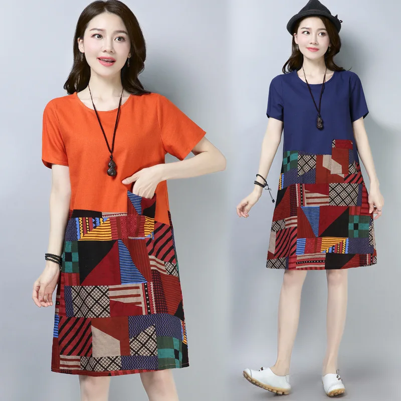 BEST SELLER Photo Shoot 2019 Summer Wear New Style Ethnic-Style Loose-Fit Joint Printed Short Sleeve Cotton Lin